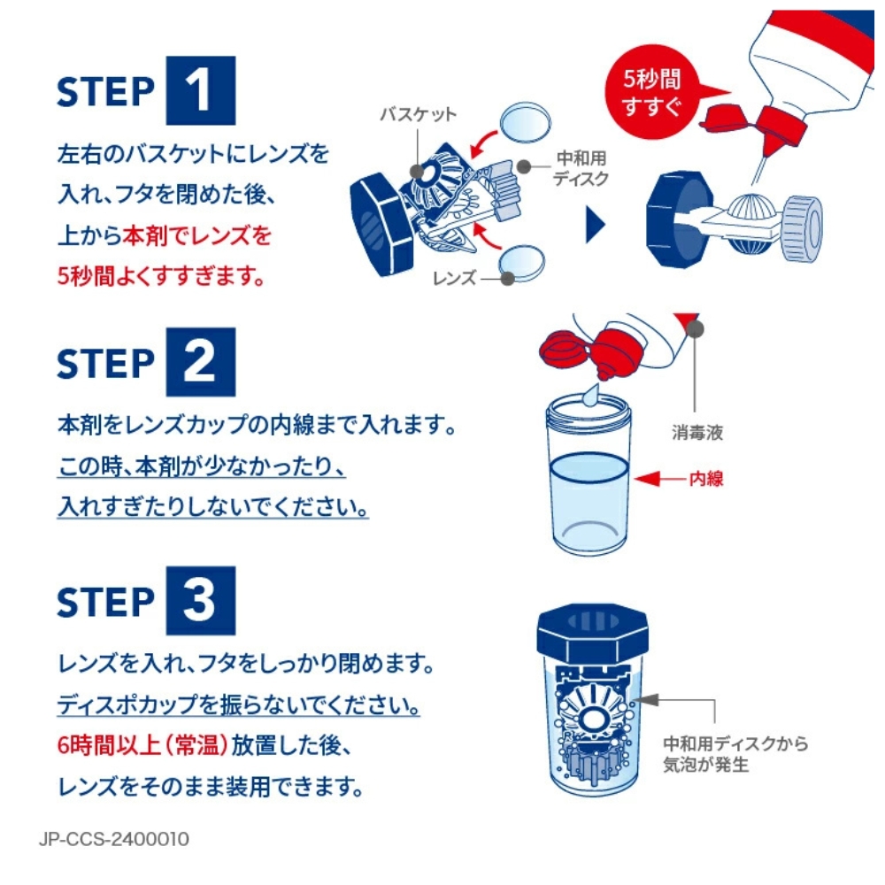 2. 変わらない「強力洗浄」&「こすり洗い不要」 独自の過酸化水素の力で、レンズに付着した細菌・真菌・アカントアメーバを99%消毒。プラチナディスクから発生する数千個のミクロの泡が、こすり洗いでは落としきれない汚れや花粉を浮き上がらせて除去します。 6時間つけておくだけで、洗浄・消毒・中和が自動で完了します。